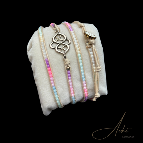 Pulseira peça única com 5 voltas produzida cordáo, pedras e cristais Swarovski e pingente metálico.