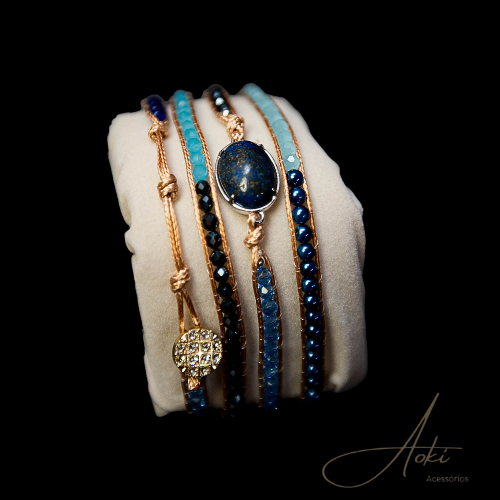 Pulseira peça única com 5 voltas produzida cordáo, pedras e cristais Swarovski e pingente azul marinho.